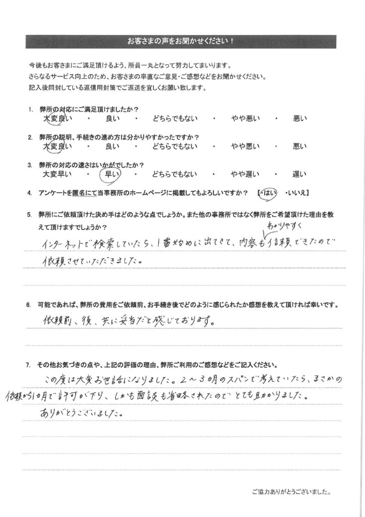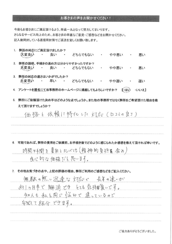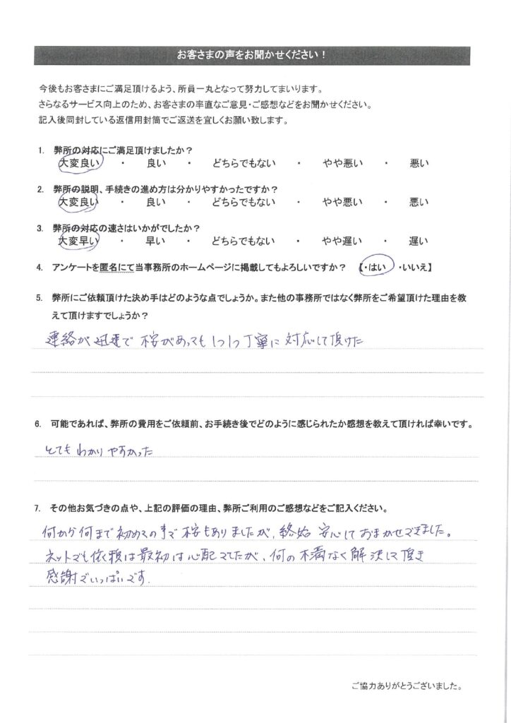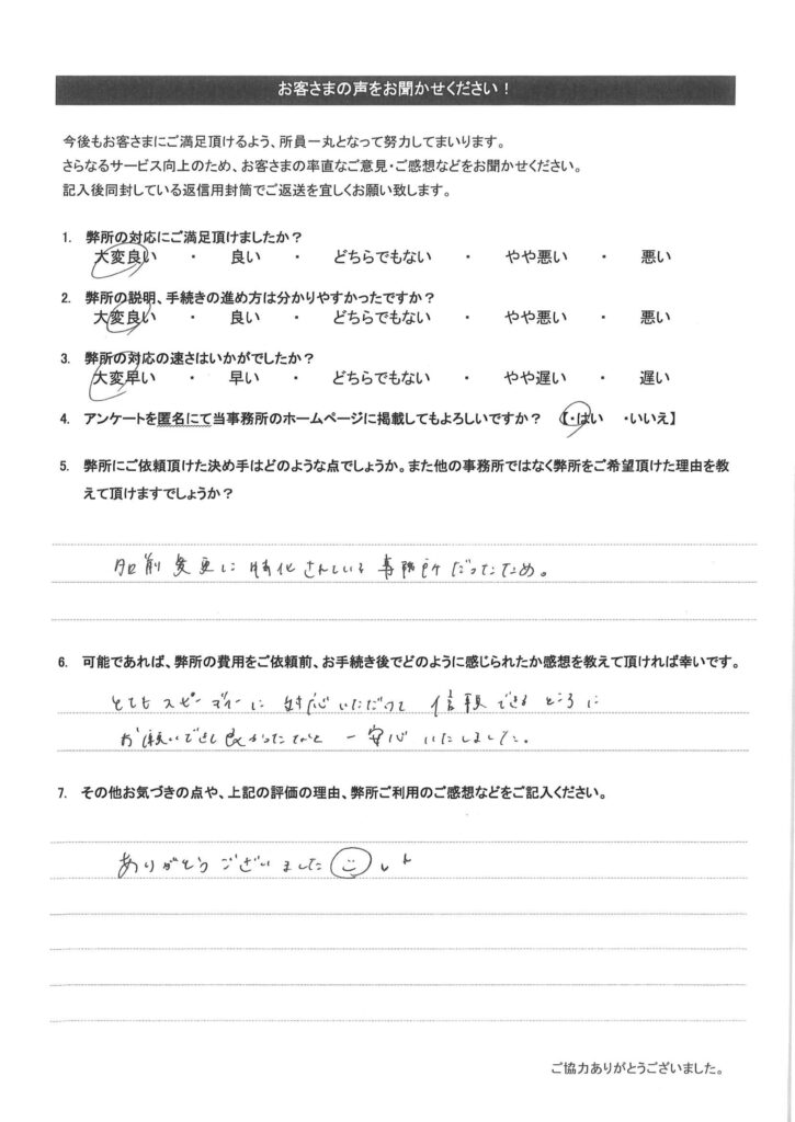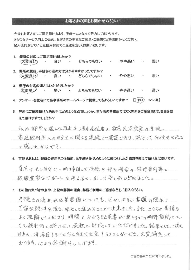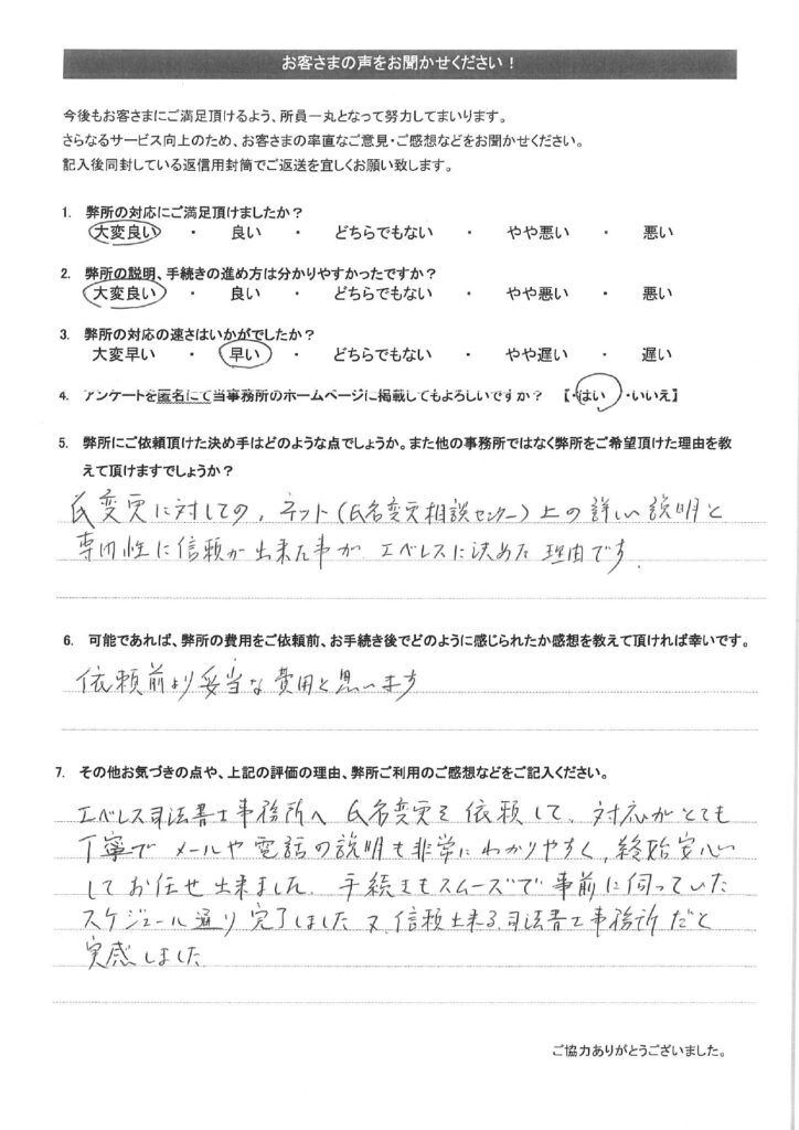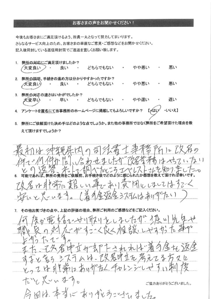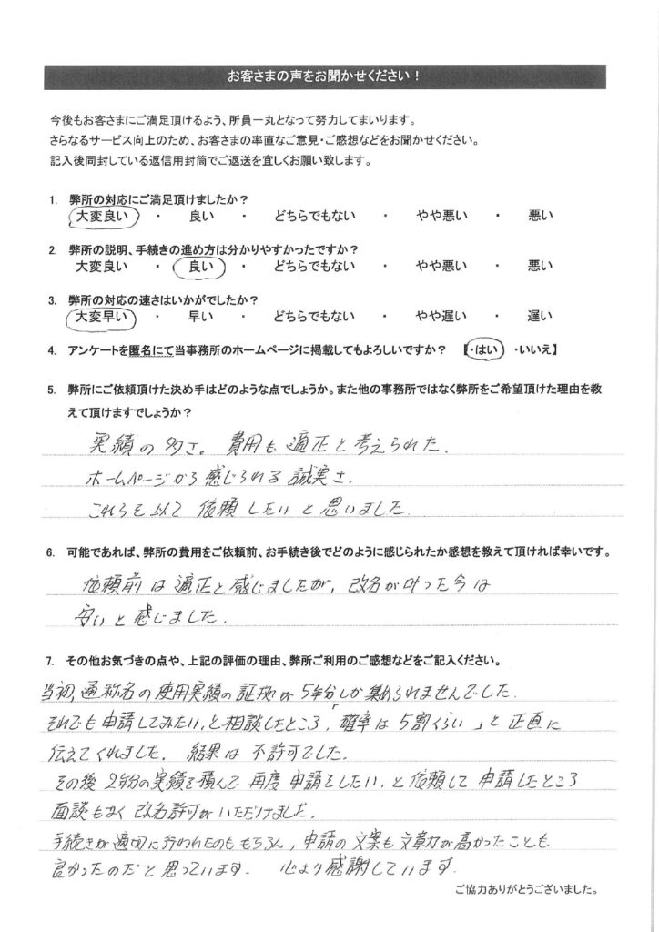 お客様の声(25) 2024年5月1日 2025年10月1日 弊所で改名手続きをして頂いたお客様のアンケートです。氏名変更相談センターの評判や口コミを調べられたい方はご参考下さい。全て皆様から掲載許可を頂いております。クリックで拡大表示されます。その他のお客様の声は「その他のお客様の声(一覧)」をご参考下さい。 その他のお客様の声はこちらをご参考下さい。・その他のお客様の声(一覧)・お客様の声から実現したサービス