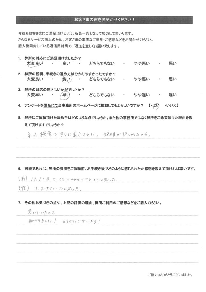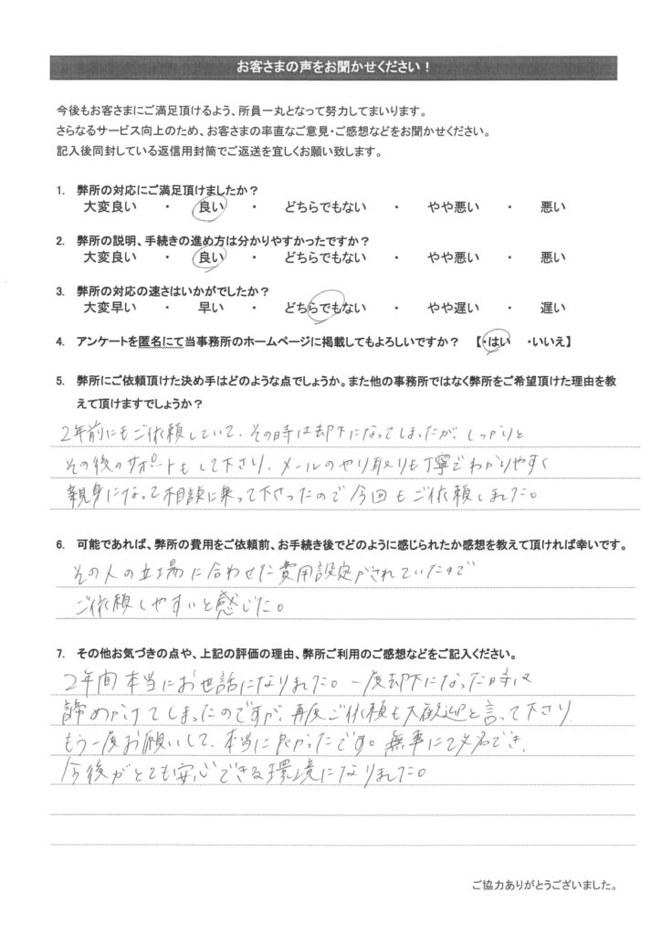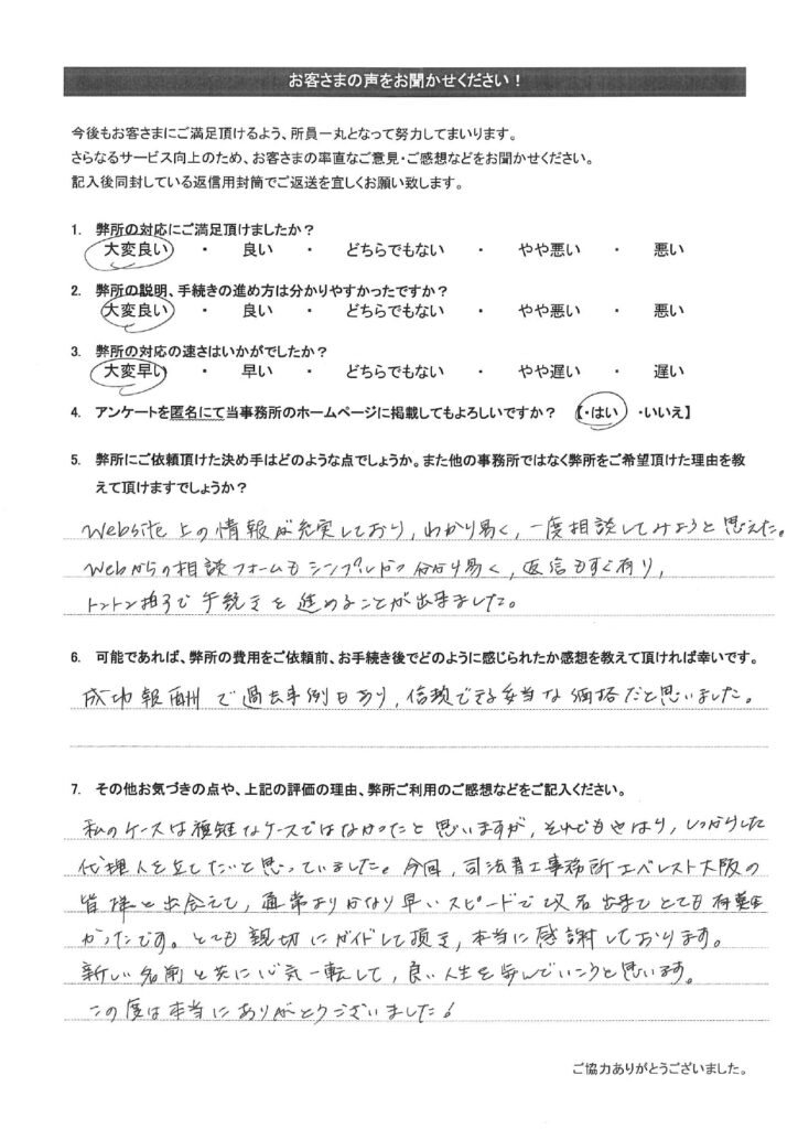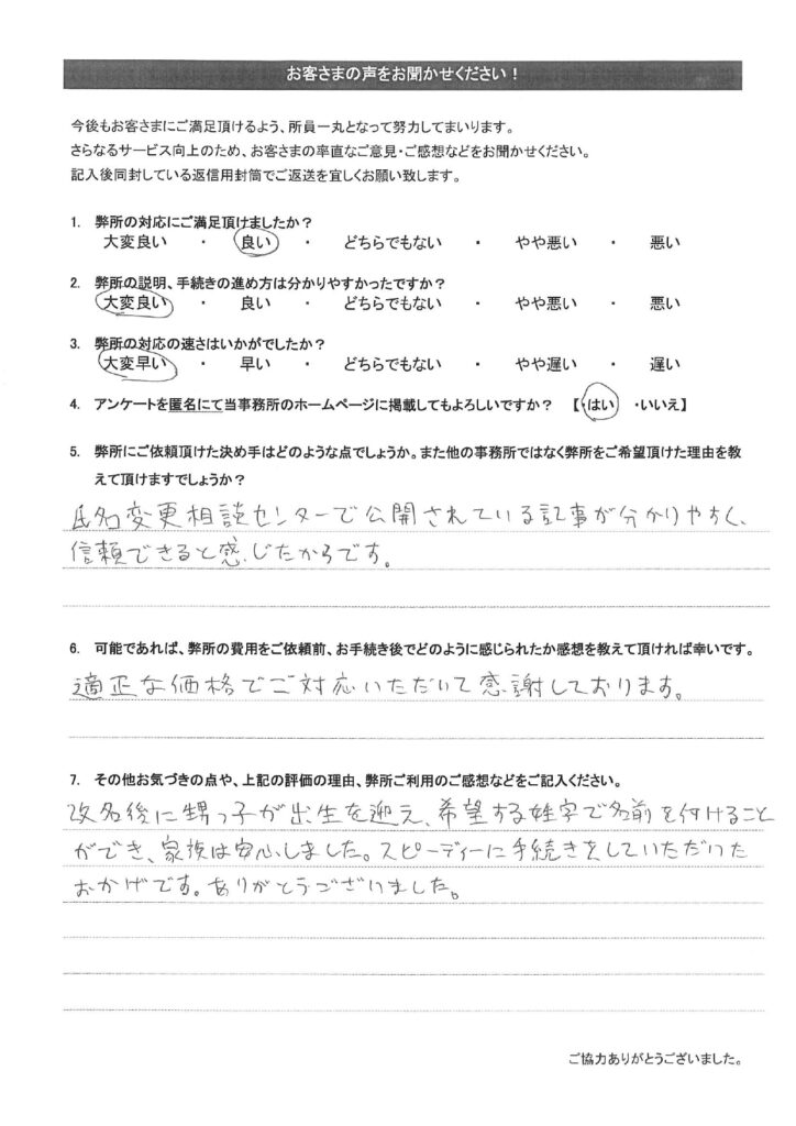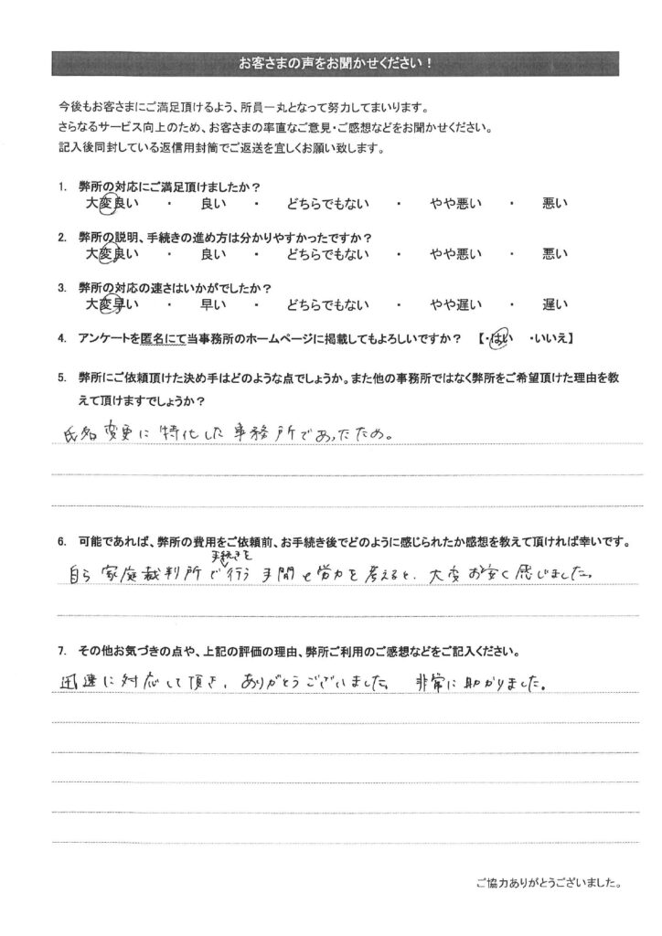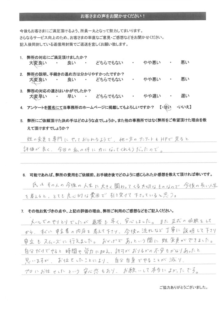 弊所で改名手続きをして頂いたお客様のアンケートです。